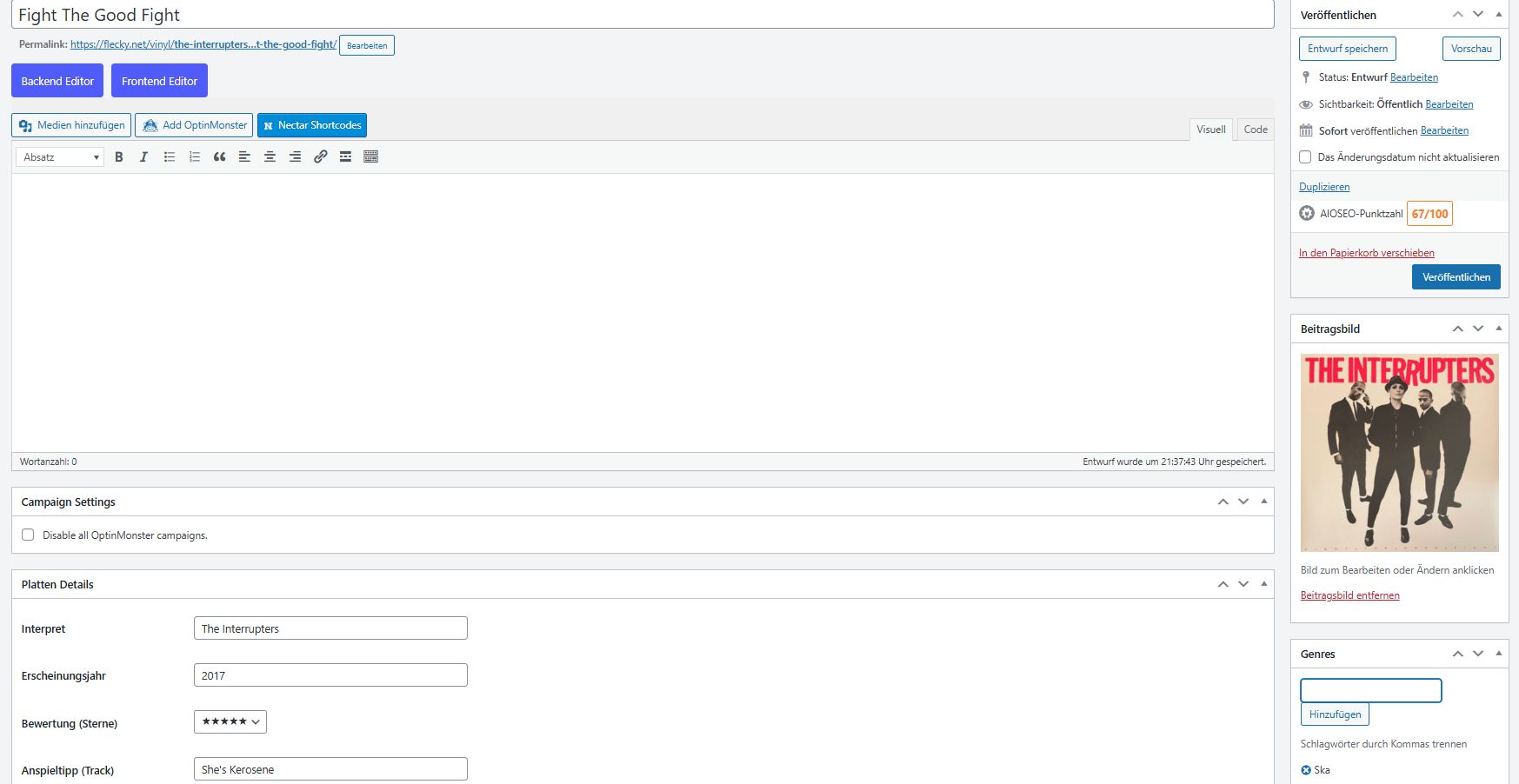 Wie in WordPress üblich können auf der rechten Seite Kategorien und Tags vergeben werden, sowie ein Beitragsbild (Plattencover) hinterlegt werden.