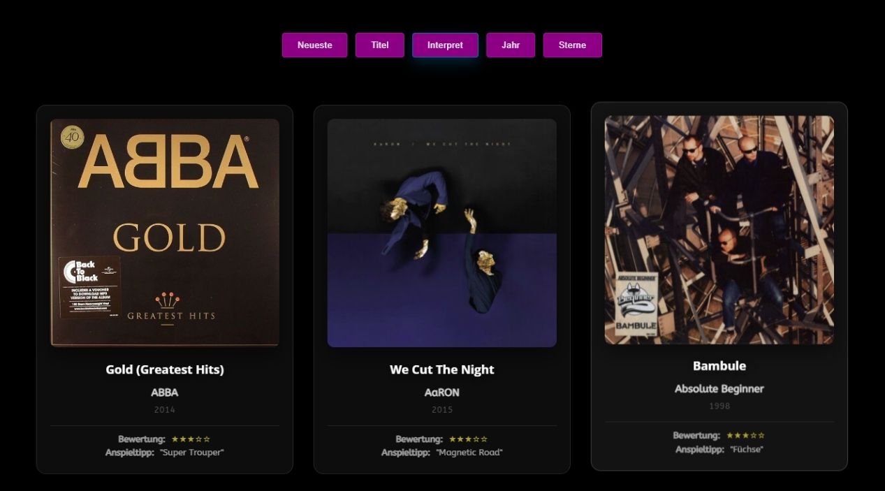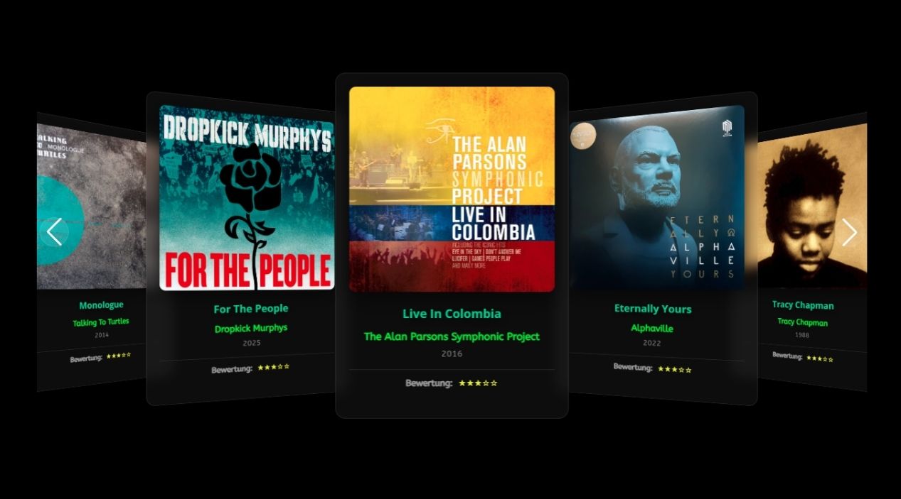 Ausgabe als Carousel oder sortierbares Grid (Interpret, Titel, Jahr, Bewertung)