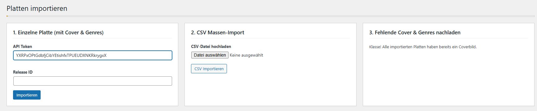 Das Plugin kann auch die von Discogs exportierten CSV-Dateien importieren und daraus die Platten automatisch anlegen. Hierfür in Discogs die eigene Sammlung als CSV exportieren lassen (dauert eine Weile) und dann in Feld 2 (CSV Massenimport) hochladen.