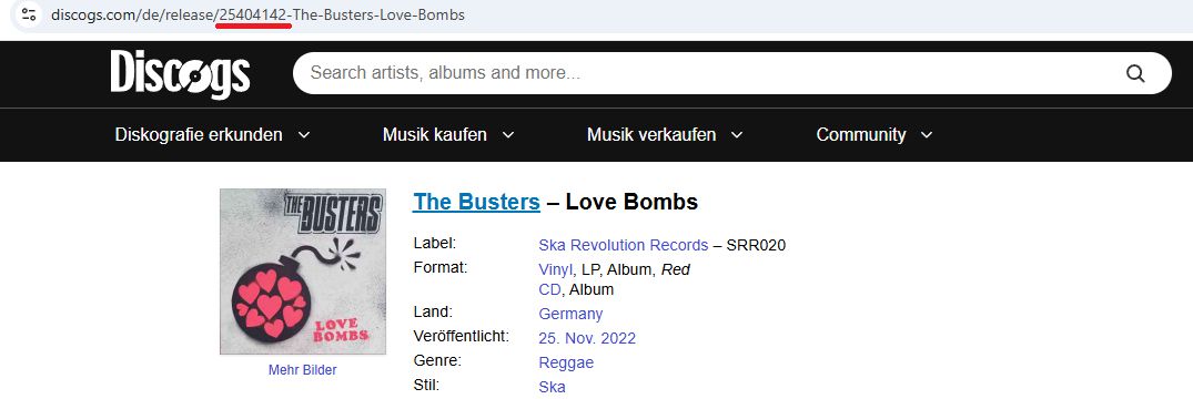 Die jeweilige Release ID findet man in der Discogs URL der jeweiligen Veröffentlichung (die Zahl im Pfad).
