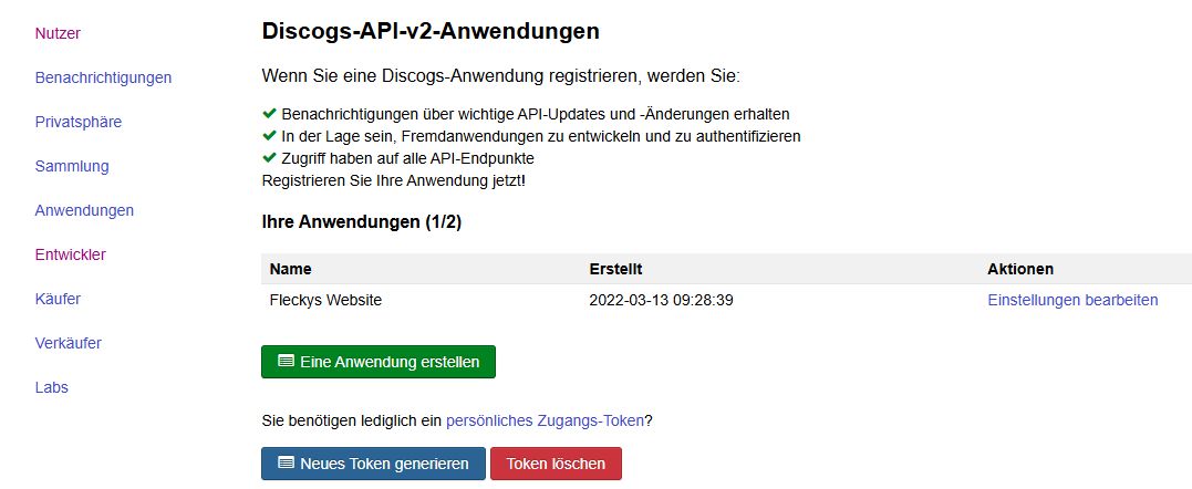 Für den Einzelimport muss zunächst ein gültiger Discogs API Token hinterlegt werden. Diesen erhält man unkompliziert im eigenen Discogs Konto unter “Profil” ➔ “Einstellungen” ➔ “Entwickler”.