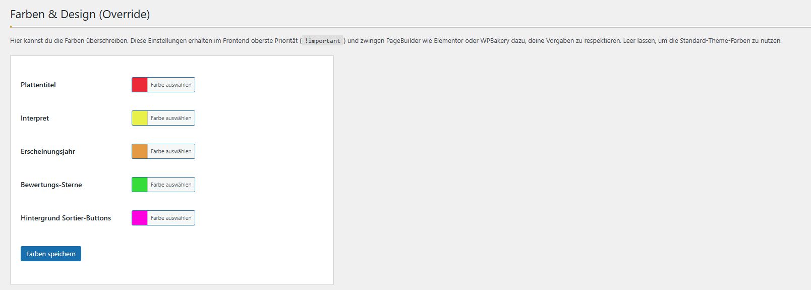Im Menüpunkt “Farben” können die Schriftfarben für Titel, Interpret und Jahr, sowie die Hintergrundfarben der Bewertungssterne und der Filter-Buttons festgelegt werden. Diese überschreiben die Standardeinstellungen von Theme und Page Builder.
