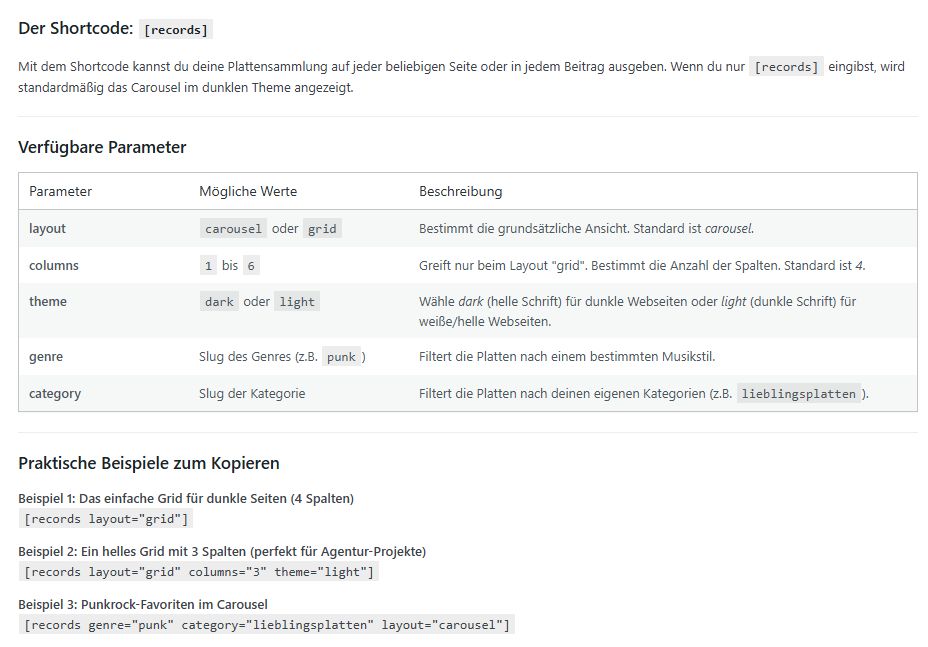 Das WordPress Plugin Vinyl Library arbeitet mit dem Shortcode [records]. Dieser kann an jeder Stelle in Seiten oder Blogposts verwendet werden.